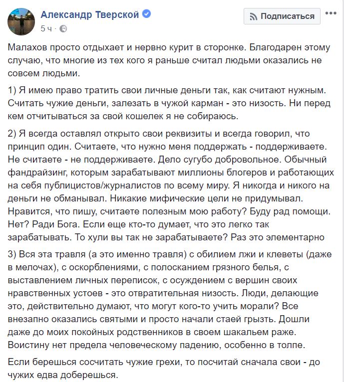 2) Я всегда оставлял открыто свои реквизиты и всегда говорил, что принцип один. Считаете, что нужно меня поддержать – поддерживаете. Не считаете – не поддерживаете. Дело сугубо добровольное. Обычный фандрайзинг, которым зарабатывают миллионы блогеров и работающих на себя публицистов/журналистов по всему миру. Я никогда и никого на деньги не обманывал. Никакие мифические цели не придумывал. Нравится, что пишу, считаете полезным мою работу? Буду рад помощи. Нет? Ради Бога. Если еще кто-то думает, что это легко так зарабатывать. То хули вы так не зарабатываете? Раз это элементарно", – заявил Тверской.