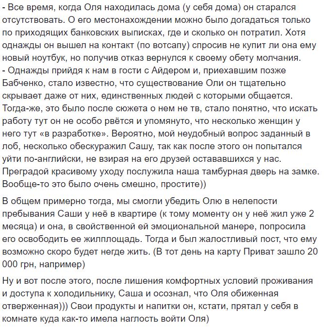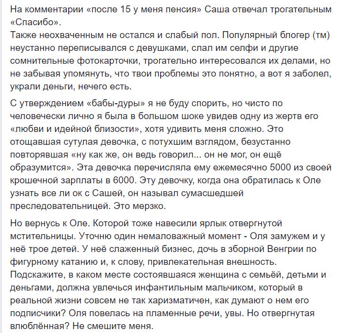 С утверждением "бабы-дуры" я не буду спорить, но чисто по-человечески лично я была в большом шоке увидев одну из жертв его "любви и идейной близости", хотя удивить меня сложно. Это отощавшая сутулая девочка с потухшим взглядом, безустанно повторявшая: "Ну как же, он ведь говорил... он не мог, он еще образумится". Эта девочка перечисляла ему ежемесячно 5000 из своей крошечной зарплаты в 6000. Эту девочку, когда она обратилась к Оле узнать, все ли ок с Сашей, он называл сумасшедшей преследовательницей", – пишет журналистка.