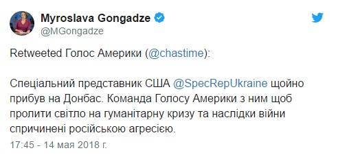 Спецпредставитель Госдепартамента США по вопросам Украины Курт Волкер прибыл на Донбасс, как ранее и планировалось. Об этом в Twitter написала журналистка Мирослава Гонгадзе.