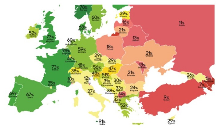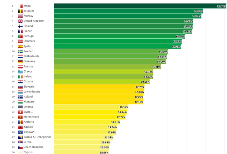 На первом месте с показателем 91%, оказалась Мальта. Кроме нее, в топ-10 стран с лучшим показателем отношения к правам сексуальных меньшинств попали Бельгия, Норвегия, Великобритания, Финляндия, Франция, Португалия, Дания, Испания и Швеция.