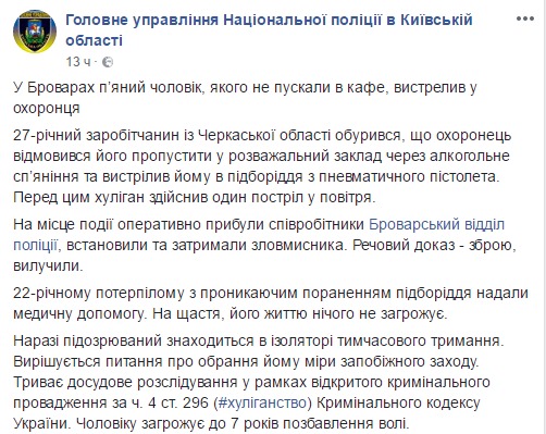 В Броварах Киевской области пьяный мужчина, которого не пускали в кафе, выстрелил в охранника.