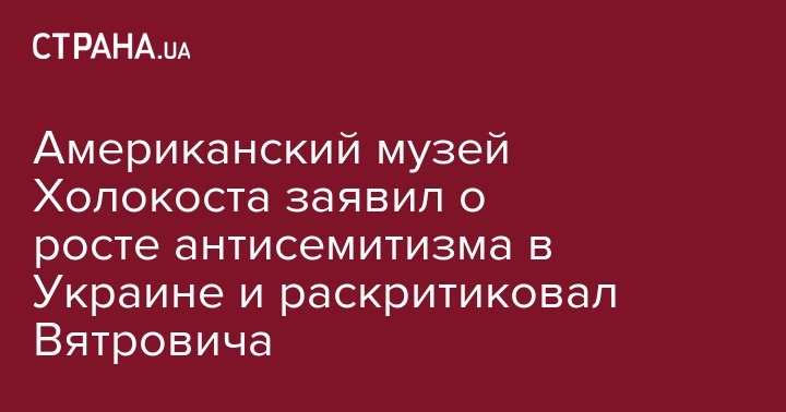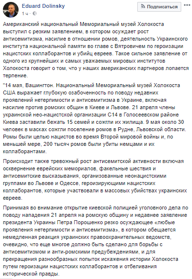 Американский национальный Мемориальный музей Холокоста сделал резкое заявление, в котором осуждает рост антисемитизма, насилие в отношении ромов, деятельность Украинского института национальной памяти во главе с Вятровичем по героизации нацистских коллаборантов и убийц евреев. Об этом на своей странице в Facebook написал глава Украинского еврейского комитета Эдуард Долинский.