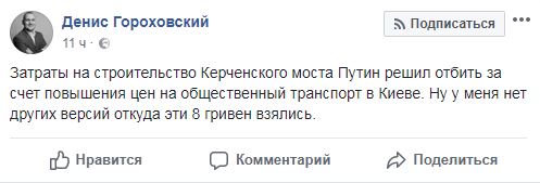 "Затраты на строительство Керченского моста Путин решил отбить за счет повышения цен на общественный транспорт в Киеве. Ну у меня нет других версий откуда эти 8 гривен взялись", - пишет Денис Гороховский.