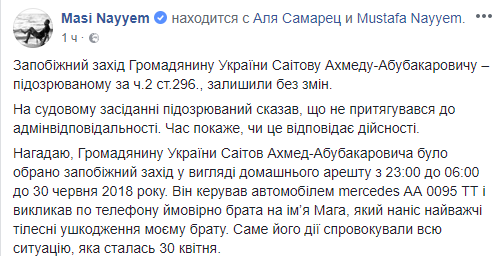 "Мера пресечения гражданину Украины Саитова Ахмеду Абубакаровичу - подозреваемому по ч.2 ст.296. - оставили без изменений", - написал он.
