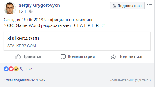 "Я официально заявляю: GSC Game World разрабатывает S.T.A.L.K.E.R. 2", — написал он в Facebook.