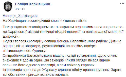 В среду, 16 мая восьмилетний мальчик находился дома один. Он выпал из окна пятого этажа одного из домов в Харькове. Об этом сообщила пресс-служба Главного управления Нацполиции в Харьковской области.