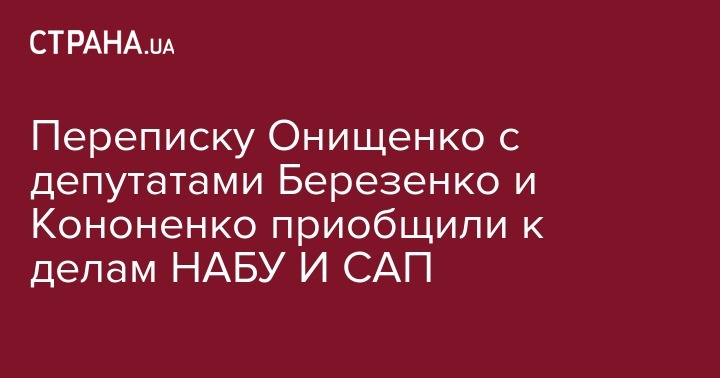 Национальное антикоррупционное бюро (НАБУ) и Специализированная антикоррупционная прокуратура (САП) приобщили переписку депутата Верховной Рады Александра Онищенко (внефракционный) с депутатами Сергеем Березенко и Игорем Кононенко (оба - фракция "Блок Петра Порошенко") к основному делу о пленках.