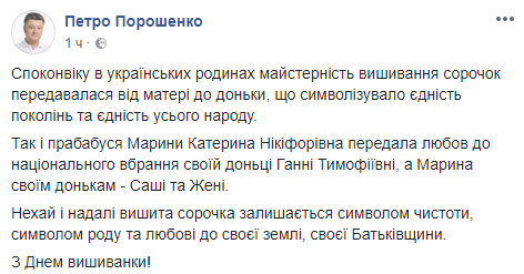 "В украинских семьях мастерство вышивания рубашек передавалась от матери к дочери, что символизировало единство поколений и единство всего народа. Так и прабабушка Марины Екатерина Никифоровна передала любовь к национальной одежды своей дочери Анне Тимофеевне, а Марина своим дочерям - Саше и Жене. Пусть и в дальнейшем вышитая рубашка остается символом чистоты, символом рода и любви к своей земле, своей Родине", - говорится в сообщении на странице президента.