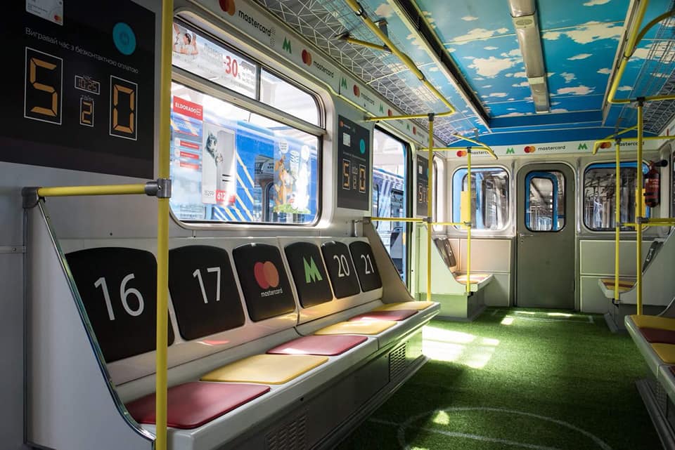 Вагон метро стилизованный под футбольное поле. На спинках сидений обозначены номера "игроков".