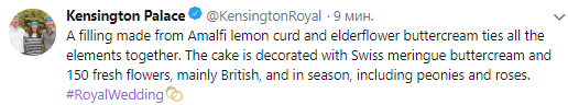 Главный десерт приготовила кондитер Клэр Птэк. Начинка свадебного торта сделана из лимонного крема и нежного наполнителя из взбитого сливочного масла и сахарной пудры. Лакомство украшено швейцарской меренгой и 150 свежими цветами – белым розами и пионами.