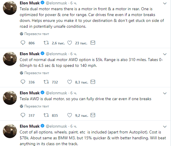 Маск отметил, что новая модификация электромобиля Model 3 получит два двигателя  в передней и в задней части машины.