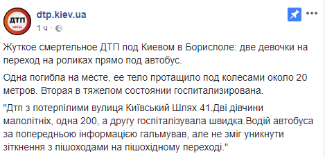 Рейсовый автобус "Чигирин-Киев", который ехал через Борисполь, сбил на переходе двух девочек, которые переезжали дорогу на роликовых коньках.