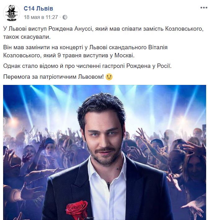 "Во Львове выступление Рождена Ануси, который должен был петь вместо Козловского, также отменили. Он должен был заменить на концерте во Львове скандального Виталия Козловского, который 9 мая выступил в Москве. Однако стало известно и о многочисленных гастролях Рождена в России", - уточняется в сообщении.