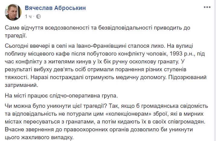 В селе в Ивано-Франковской области 25-летний мужчина бросил гранату в толпу людей. Об этом сообщил первый замглавы Национальной полиции Вячеслав Аброскин в Facebook.