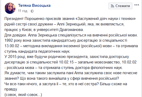 Президент Украины Петр Порошенко присвоил звание "Заслуженный деятель науки и техники" своей свояченице (родной сестре своей жены) - Алле Зернецкой, которая работает в Киеве, в университете Драгоманова.