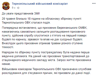 "Предварительно установлено, что призывник Бережанского военкомата, пытаясь самовольно покинуть расположение призывного пункта, предпринял попытку спуститься с пятого на первый этаж здания по карнизу, сорвался и упал на крышу соседнего здания. В результате парень получил травмы различной степени тяжести",- говорится в сообщении в соцсети.