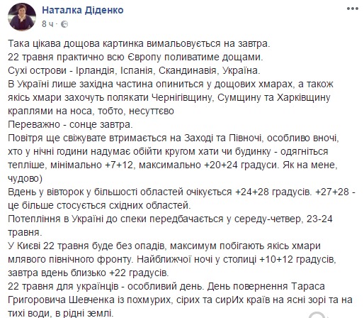 "Потепление в Украине к жаре предполагается в среду-четверг, 23-24 мая. В Киеве 22 мая будет без осадков, максимум побегают какие облака вялого северного фронта. Ближайшей ночью в столице +10 +12 градусов, завтра днем около +22 градусов... Потепление в Украине до жары предполагается в среду-четверг, 23-24 мая", -написала она.