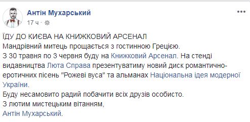 "Странствующий художник прощается с гостеприимной Грецией. С 30 мая по 3 июня буду на Книжном Арсенале. Буду неистово рад увидеть всех друзей лично. С лютым художественным приветствием, Антин Мухарский”, - написал актер.