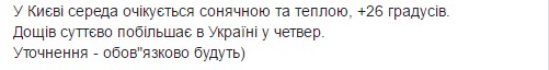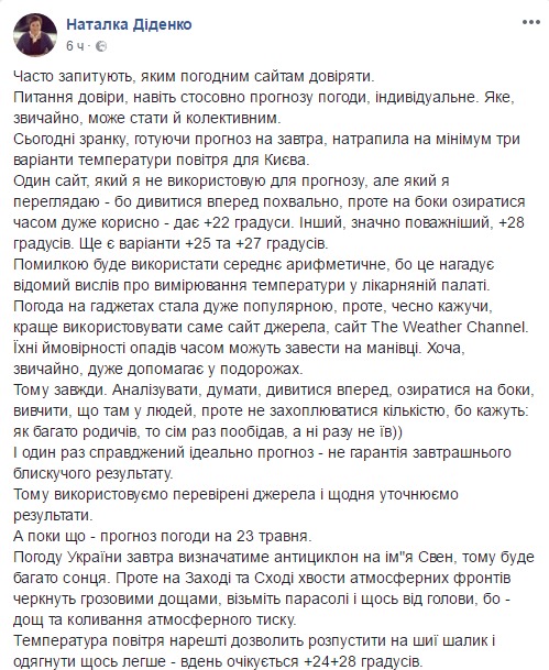 "Погоду Украины завтра будет определять антициклон по имени Свен, поэтому будет много солнца. Однако на Западе и Востоке хвосты атмосферных фронтов черкнуть грозовыми дождями, возьмите зонты и что-то от головы, потому что дождь это колебания атмосферного давления. Температура воздуха наконец позволит распустить на шее шарфик и одеть что-то легче - днем ожидается + 24 + 28 градусов. В Киеве в среду погода ожидается солнечной и теплой, +26 градусов. Дождей существенно больше в Украине в четверг", - написала она и опубликовала фото антициклона по имени Свен.