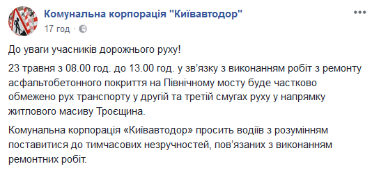 "23 мая с 08:00 до 13:00 в связи с выполнением работ по ремонту асфальтобетонного покрытия на Северном мосту будет частично ограничено движение транспорта во второй и третьей полосах движения в направлении жилого массива Троещина", - уточнили в пресс-службе КК "Киевавтодор".