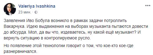 Журналист Валерия Ивашкина считает, что это троллинг: "Заявления Иво Бобула возникло в рамках задачи потроллить Вакарчука. Идею выдвижения на выборах музыканта пытаются довести до абсурда. Мол, да вы что, издеваетесь, ну какой ещё музыкант? И вернуть ситуацию в контролируемое русло.
