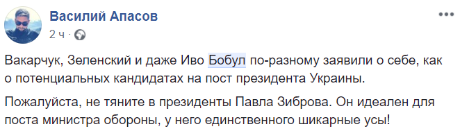 Пожалуйста, не тяните в президенты Павла Зиброва. Он идеален для поста министра обороны, у него единственного шикарные усы!", - пишет журналист Василий Апасов.