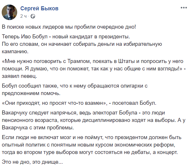 "Иво Бобул, звезда украинской сцены времен СССР, сделал заявление, что он идет в президенты. Наверняка, просто стебется. Но, заметьте, до чего довели пенсионеров советсткой украинской эстрады, если даже они уже стебутся".