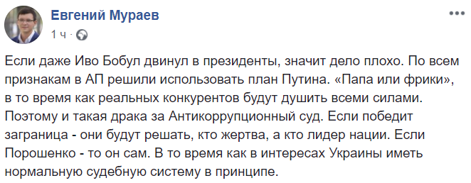 "Если даже Иво Бобул двинул в президенты, значит дело плохо. По всем признакам в АП решили использовать план Путина. "Папа или фрики", в то время как реальных конкурентов будут душить всеми силами. Поэтому и такая драка за Антикоррупционный суд. Если победит заграница - они будут решать, кто жертва, а кто лидер нации. Если Порошенко - то он сам. В то время как в интересах Украины иметь нормальную судебную систему в принципе", - пишет нардеп Евгений Мураев.