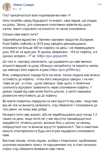 Не стоит пить кофе вообще или не преувеличивать дозу более 1-2 чашки в день, если после него ощутимо ускоряется сердцебиение, потеют ладони, возникает боль в желудке или печени, ухудшается сон и возникает чувство тревоги. Такие же симптомы могут наблюдаться у любого в случае чрезмерного потребления кофе", - пишет в соцсети Ульяна Супрун и добавляет, что беременным женщинам, пожилым людям, или людям с гипертонией, проблемами желудочно-кишечного тракта и нарушениями сна, в состоянии сильного стресса, следует ограничить употребление кофе тоже.