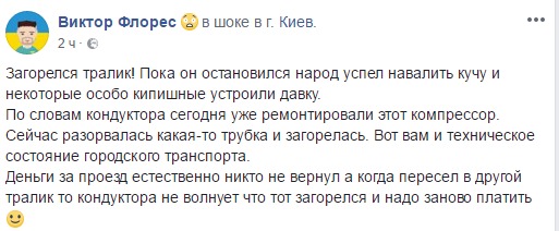 Флорес также добавил, что деньги за проезд пассажирам не вернули. "Когда пересел в другой троллейбус, кондуктора не волновало, что тот загорелся и надо заново платить", - возмутился киевлянин.