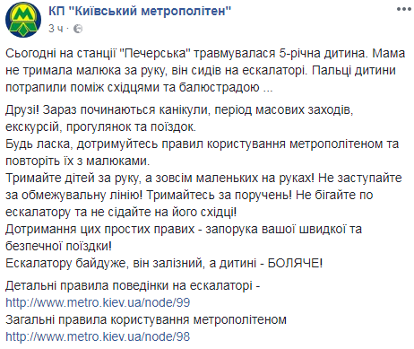 "Сегодня на станции "Печерская" травмировался 5-летний ребенок. Мама не держала малыша за руку, он сидел на эскалаторе. Пальцы ребенка попали между ступенями и балюстрадой", - говорится в сообщении.