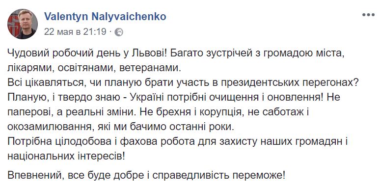 Бывший глава СБУ Валентин Наливайченко будет баллотироваться в президенты Украины на выборах в марте 2019 года. Об этом сообщает пресс-служба политика в Facebook.