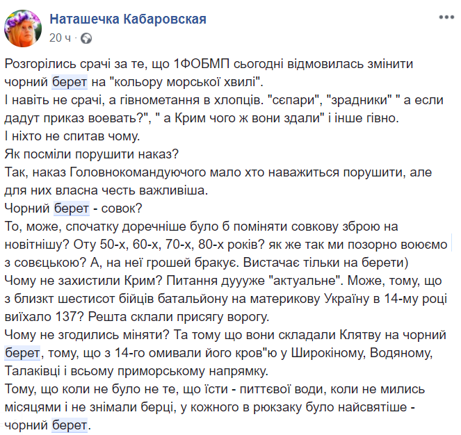 "Черный берет – совок? Может, сначала уместнее было бы поменять совковое оружие на то, что поновее? То, что 50-х, 60-х, 70-х, 80-х годов? Как же так мы позорно воюем с советским? А на новое денег не хватает. Хватает только на береты", – пишет пользователь Наталья Кабаровская.