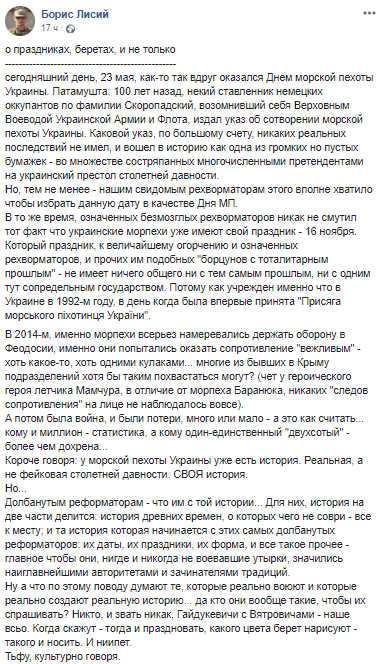"Сегодняшний день, 23 мая, как-то так вдруг оказался Днем морской пехоты Украины. Патамушта: 100 лет назад, некий ставленник немецких оккупантов по фамилии Скоропадский, возомнивший себя Верховным Воеводой Украинской Армии и Флота, издал указ об сотворении морской пехоты Украины. Каковой указ, по большому счету, никаких реальных последствий не имел и вошел в историю как одна из громких но пустых бумажек – во множестве состряпанных многочисленными претендентами на украинский престол столетней давности.