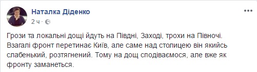 "Вообще фронт пересекает Киев, но именно над столицей он какой-то слабый, растянутый. Поэтому на дождь надеемся, но уже как фронта заблагорассудится", - написала Диденко.