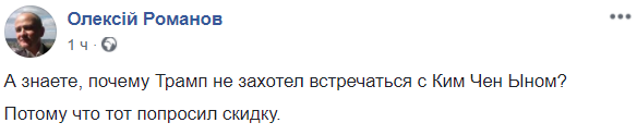 "Трамп отказался встречаться с Ким Чен Ыном. У того не нашлось 400 тыс.$!", - вторит ему блогер Кирилл Молчанов.