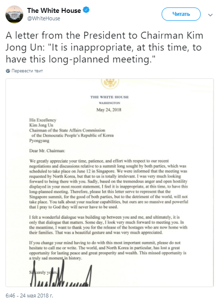 Причиной срыва Трамп назвал "открытую враждебность" Пхеньяна в отношении Вашингтона. В то же время президент США заявил, что готов встретиться с северокорейским лидером в будущем.