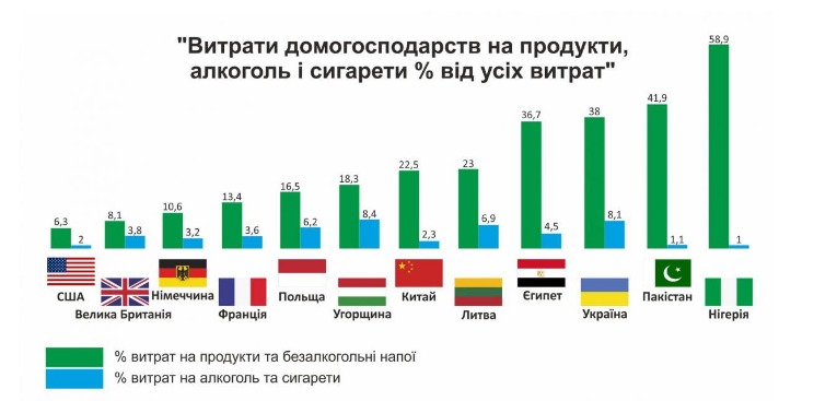 "Если сложить расходы на питание, сигареты и алкоголь, то наша страна входит в ТОП-5 стран мира с самыми высокими расходами. Украинцы, по данным Соединенных Штатов, потратили в 2016 году 38% от всех доходов на продукты и 8,1% на алкоголь и сигареты. То есть общие затраты на эти две группы составили 46,1%. Страной, где граждане имеют наименьшие затраты на продукты и вредные привычки, являются Соединенные Штаты", - говорится в сообщении.