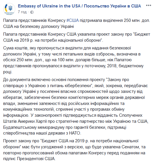Сумма, которую предлагается выделить для предоставления военной помощи Украине, в том числе и на летальные виды вооружений, определена в объеме $250 миллионов, что на 100 миллионов больше, чем Палатой представителей предлагалось выделить в текущем, 2018, бюджетном году.