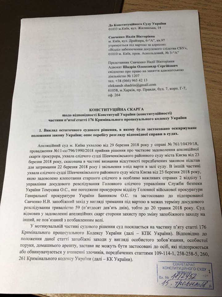 24 мая СМИ сообщили, что в Конституционный суд поступила жалоба от Надежды Савченко на незаконность своего содержания под стражей. Документ был рассмотрен в секретариате суда и принят как соответствующий по форме.