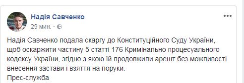 "Надежда Савченко подал жалобу в Конституционный суд Украины, чтобы оспорить ч.5 ст.176 Уголовно-процессуального кодекса Украины, согласно которой ей продлили арест без возможности внесения залога и взятия на поруки", - говорится в сообщении/