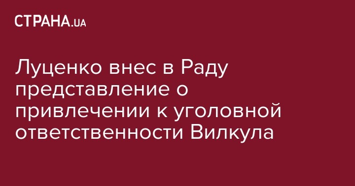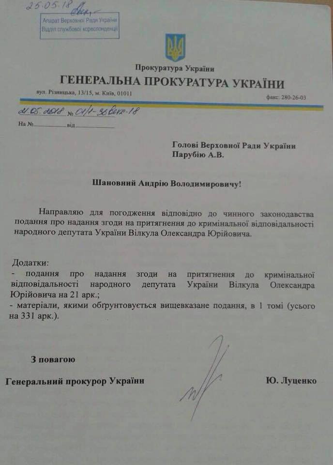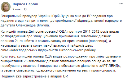 Генеральный прокурор Украины Юрий Луценко внес в ВР представление о даче согласия на привлечение к уголовной ответственности народного депутата Александра Вилкула (Оппозиционный блок). Об этом на своей странице в Facebook написала пресс-секретарь генпрокурора Лариса Сарган.