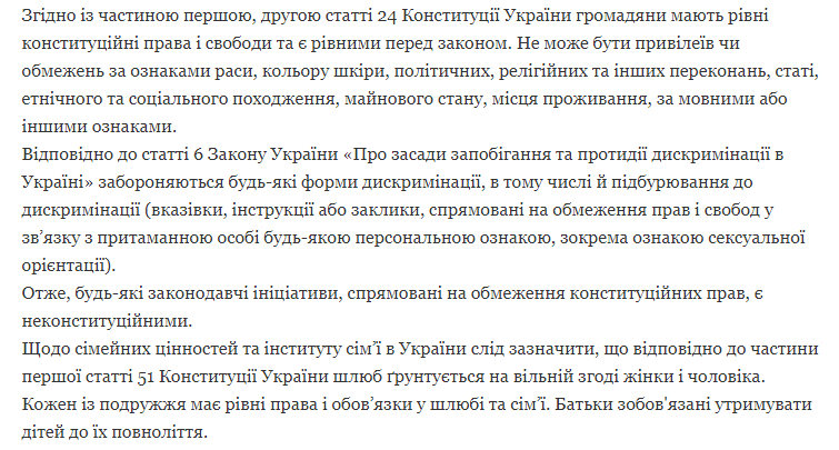 Кроме того, в соответствии с законодательством Украины, запрещаются любые формы дискриминации, в том числе и подстрекательство к дискриминации.