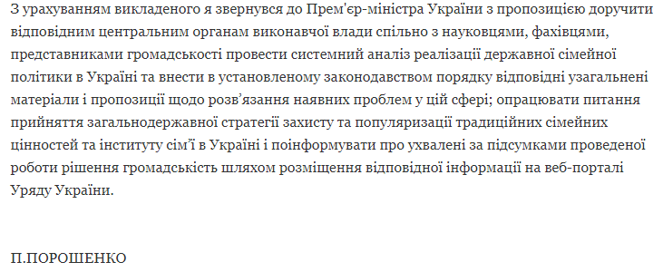 В ответе Порошенко также говорится, что он обратился к премьер-министру Украины с предложением поручить соответствующим центральным органам исполнительной власти совместно с учеными, специалистами, представителями общественности провести системный анализ реализации государственной семейной политики в Украине и внести в установленном законодательством порядке соответствующие обобщенные материалы и предложения по решению имеющихся проблем в этой сфере.