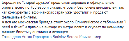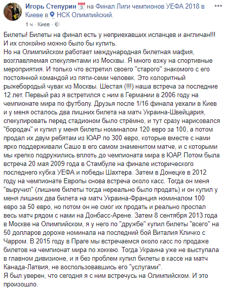 По словам Степурина, официальные билеты продаются по 700 евро с табличками "I need а ticket" у НСК "Олимпийский", а лишние билеты скупаются у англичан и испанцев.