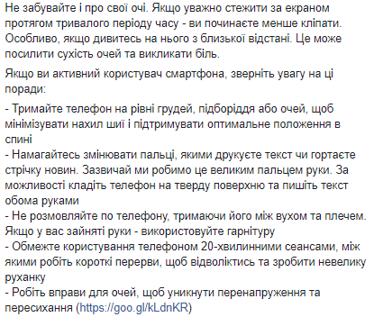 "Если вы активный пользователь смартфона, обратите внимание на эти советы. Держите телефон на уровне груди, подбородка или глаз, чтобы минимизировать наклон шеи и поддерживать оптимальное положение в спине. Старайтесь менять пальцы, которыми печатаете текст или листаете ленту новостей. Не разговаривайте по телефону, держа его между ухом и плечом. Ограничьте пользование телефоном 20-минутными сеансами, между которыми делайте короткие перерывы, чтобы отвлечься и сделать небольшую зарядку. Делайте упражнения для глаз, чтобы избежать перенапряжения и пересыхания сетчатки", - советует руководитель Минздрава.