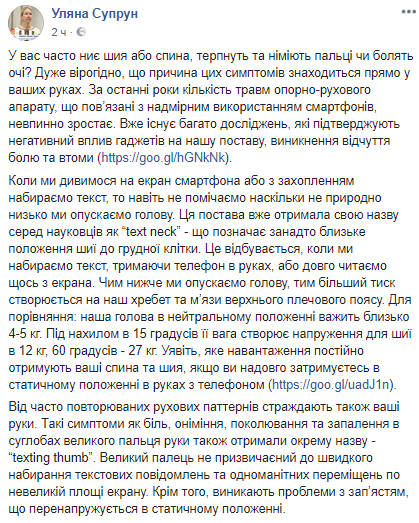 "Когда мы смотрим на экран смартфона или увлеченно набираем текст, то даже не замечаем, насколько неестественно низко мы опускаем голову. Эта поза уже получила свое название среди ученых как text neck, что обозначает слишком близкое положение шеи к грудной клетке. Это происходит, когда мы набираем текст, держа телефон в руках, или долго читаем что-то с экрана", - написала Супрун.
