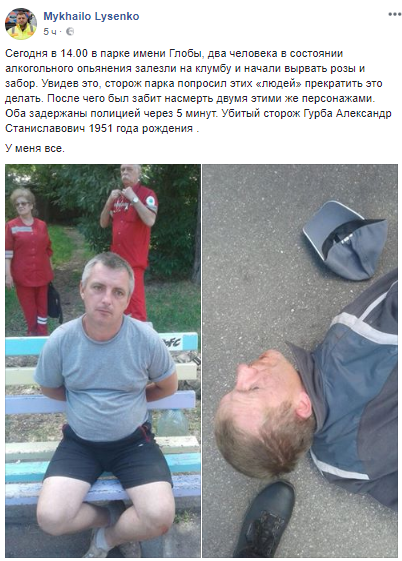 "Сегодня в 14:00 в парке имени Глобы двое мужчин в состоянии алкогольного опьянения залезли на клумбу и начали вырывать розы и ломать забор. Увидев это, сторож парка попросил этих "людей" прекратить это делать. После чего был забит насмерть двумя этими же персонажами. Оба задержаны полицией через 5 минут. Убитый сторож Гурба Александр Станиславович 1951 года", - написал он.