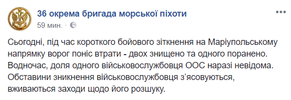 "Сегодня, во время короткого боевого столкновения на мариупольском направлении враг понес потери - двое уничтожены и один ранен. В то же время, местонахождения одного военнослужащего ООС пока неизвестно", – говорится в сообщении на странице подразделения в воскресенье вечером.