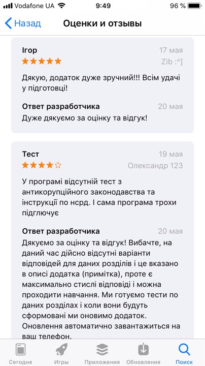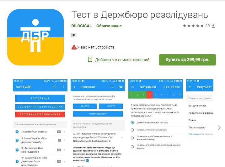 Приложение позволяет пройти тестирование по законам о госслужбе и ГБР, по Конституции Украины, а также тестирование на ошибках. Тесты касаются, например, уголовного законодательства. Кстати, пользователи, скачавшие программу уже отметили, что у программы предприиимчивого разработчика Igor Dyrda отсутствуют вопросы, связанные с антикоррупционным законодательством.